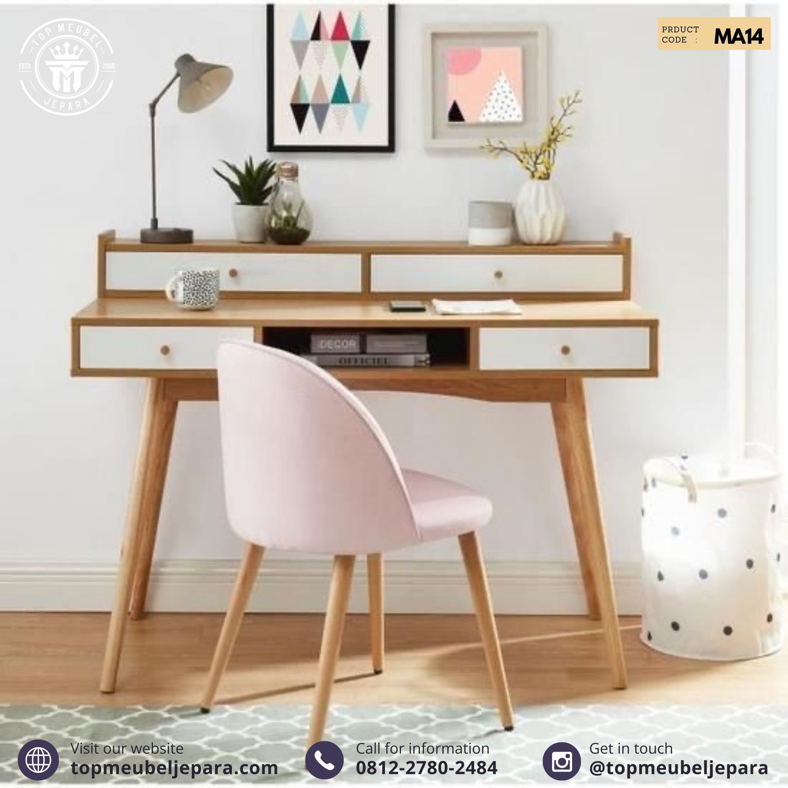 “Menciptakan ruang kerja yang stylish dan teratur dengan meja kerja Scandinavian 5 laci yang modern. Perfect blend of function and style! 🍃🖊️ #ScandiStyle #MejaKerja”