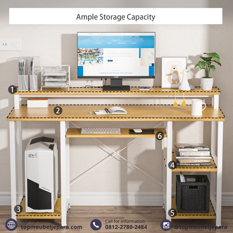 Dilengkapi dengan desk shelf panjang, Anda bisa dengan mudah menyimpan monitor, buku, dan peralatan kerja lainnya, menjadikan ruang kerja Anda lebih rapi dan terorganisir. Desain modernnya bakal menambah daya tarik visual di ruangan Anda!